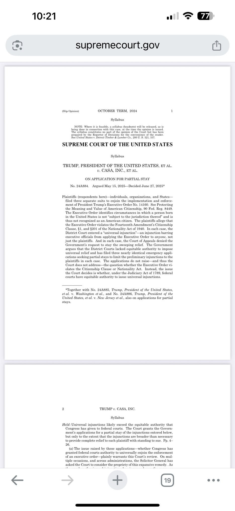 The Court granted a partial stay, indicating that the district court’s initial nationwide injunction exceeded its equitable authority, thereby limiting its broad application. The syllabus reveals that the injunction had been issued to halt the enforcement of an executive order, but the Supreme Court intervened to restrict its scope to the named plaintiffs rather than allowing it to affect the entire nation.